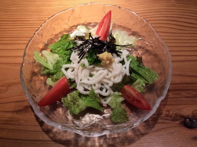 3)器に野菜をのせ、その上にすり身のそうめんをのせて上からおろししょうが・きざみネギ・きざみのりをかければ完成です。